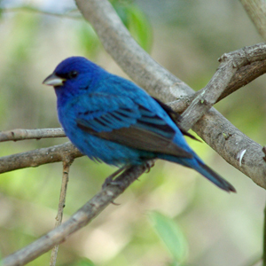 I’ve so enjoyed my walks lately – especially in the early dawn before the birds begin to sing. I’ve seen muskrats and raccoons, owls, blue herons and even an early eagle. (They usually don’t show up until November in our area.) But I’ve been very intrigued by the Indigo Bunting. The female and young buntings are brown, but the Indigo Blue of the male is striking. So I did some more research on it. I found out that the beautifully deep blue of the bunting isn’t really a blue bird – “actually it is a black bird. The bunting lacks blue pigment in its feathers (just like the Blue Jay). The sunlight is refracted within the structure of the male bunting’s feathers, making them appear blue. ” (allaboutbirds.com)
