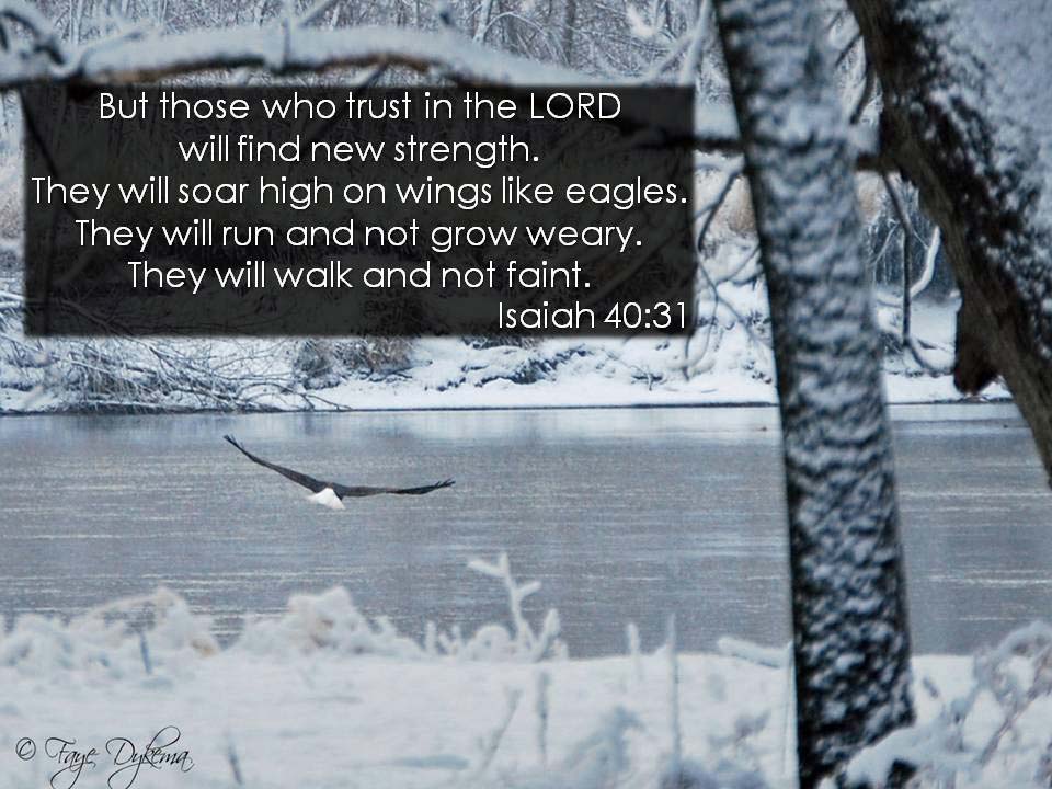 One of my dad’s favorite bible passage has been Isaiah 40:31. So for sentimental reasons alone, it’s been meaningful to me. I think of it more often because November through March we are blessed with seeing eagles near the river. They are an amazing creature. They can soar without flapping their wings, or take off with just a few strong flaps of their wings, and they are quickly lifted on the air currents. Then they can dive straight down to the river or corn field for their prey. I’ve watched two of them doing their air dance as they mate and play with each other. They never seem to tire when they are enjoying being carried by the wind.