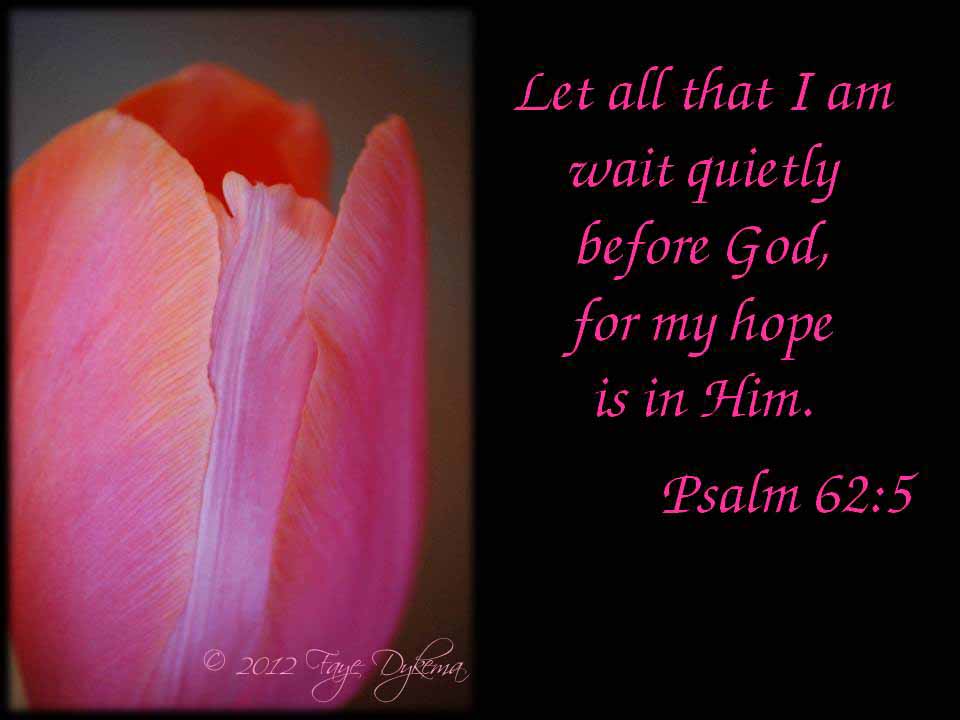 Since 2013, Psalm 62:5 “Let all that I am wait quietly before God for my hope is in Him,” has been written on my bathroom mirror where I see it every morning and several times throughout the day. I have taken it apart word by word, emphasizing different words and phrases. God has blessed me incredibly through these words. It is a constant reminder for me that whatever my concerns, “Leave them quietly to God”.