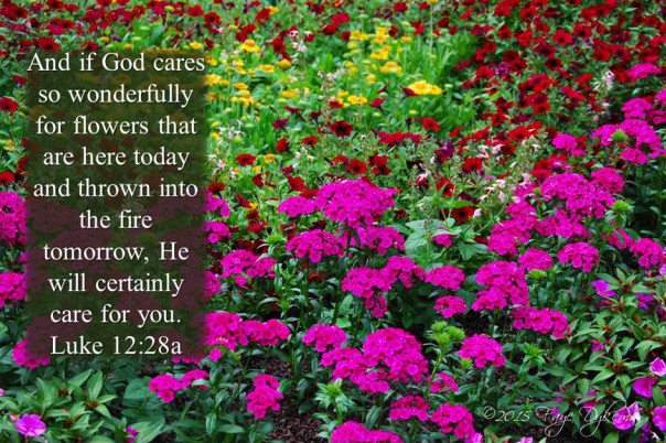 God knows that we pay attention to the beauty of flowers. We also know that they don’t last forever, and when they die we compost them or throw them away. We learn early on that a seed planted in the ground yields a plant when it is watered and the sun shines on it, all orchestrated by God. Yet, as much as God tenderly and lovingly cares for the plants, He wants us to know for certain that He cares for each and every one of us much more than He cares for the plants that are here today and gone tomorrow.