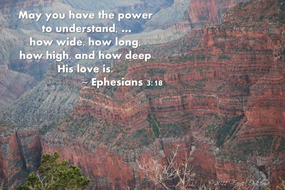 As much as it is almost impossible to SEE all of the Grand Canyon let alone hike, God’s love is so much greater. We will never fully understand it all on this earth. But oh the hope that fills this believer’s heart for the day when she will stand before God and FULLY UNDERSTAND the width and length and height and depth of my Creator, Lord and Savior.